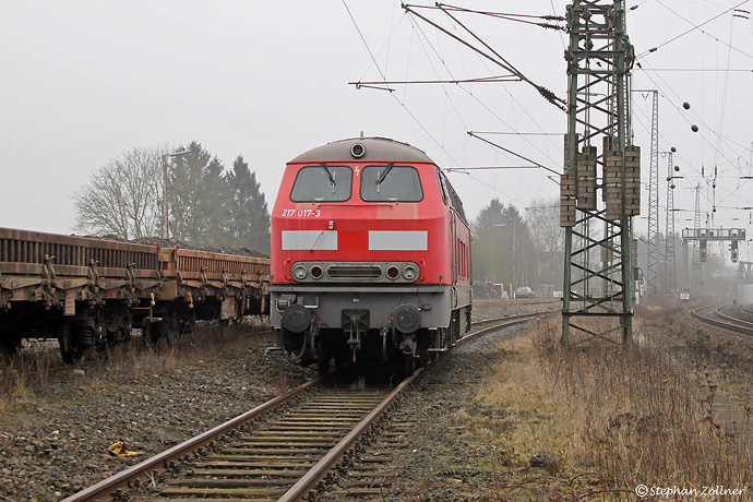 Eine betriebsfähige 217, welche im Jahr 2015 unvermittelt in Südwestfalen auftaucht, ist schon etwas Besonderes. Die 217 017 der Pfalzbahn war in der Kalenderwoche 7 neben einer 360 anscheinend für Arbeitszug-Dienste in Holzwickede verplant. Leider bewegte sich die Lok aber keinen Meter von ihrem Abstellplatz in Schwerte vom Fleck, sodass nur ein Pflichtbild von der grafittifreien Seite als Fotoausbeute übrig blieb.
