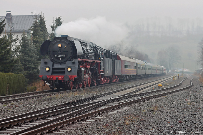 Anlässlich ihres 80. Geburtstages unternahm die bei Krupp gebaute Schnellzugdampflok 01 509 am 21. März 2015 eine Reise von Zwickau in ihre "Geburtsstadt" Essen, welche sie auch durch das Obere Ruhrtal führte. Wegen des unterirdischen Wetters wurde, wie hier zu sehen, nur ein Beweisbild an der Nuttlarer Standardfotostelle aufgenommen.