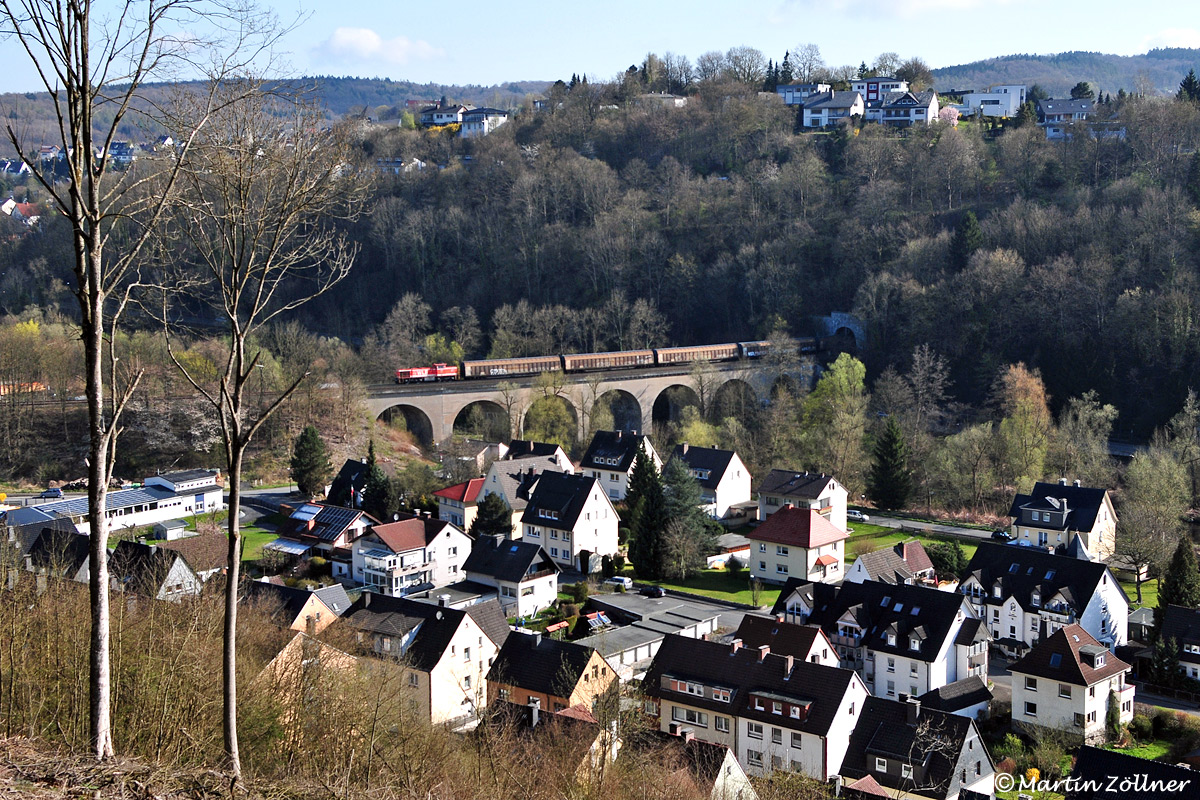 Sehr selten wird der Spanplattenzug vom Eggerwerk Brilon nach Herning (DK) bis Lippstadt mit einer G 1206 der WLE bespannt, wird die Traktion in der Regel doch durch die G 2000 sichergestellt. Am 18. April 2015 war so ein Tag, als der zwei Stunden vor Plan über den Ruhrviadukt in Arnsberg rollende Zug vom Römberg aus beobachtet werden konnte, noch bevor die für so eine Wetterlage über den Gebirgen üblichen Quellwolken das Motiv verfinsterten.