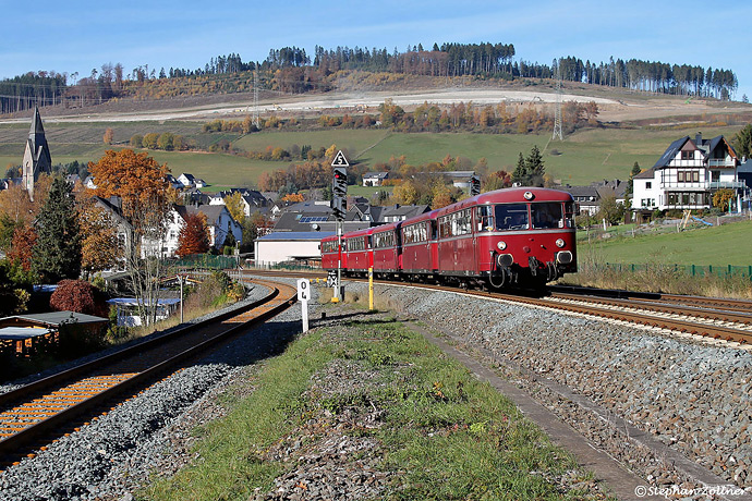 Zu einer fünftägigen Reise unter dem Motto "Im Schienenbus durch Deutschland" hatte die Eifelbahn Verkehrsgesellschaft vom 02. bis zum 06. November 2015 eingeladen. Am 02.11. wurde die erste Etappe von Linz nach Wernigerode durch das Obere Ruhrtal in Angriff genommen. Um Schlag 12 Uhr knattert der aus 798 760 + 996 309 + 996 299 + 996 248 + 798 752 gebildete Fünfteiler bei herrlichstem Sonnenschein am Abzweig Nuttlar unterhalb der Autobahnbaustelle durch.