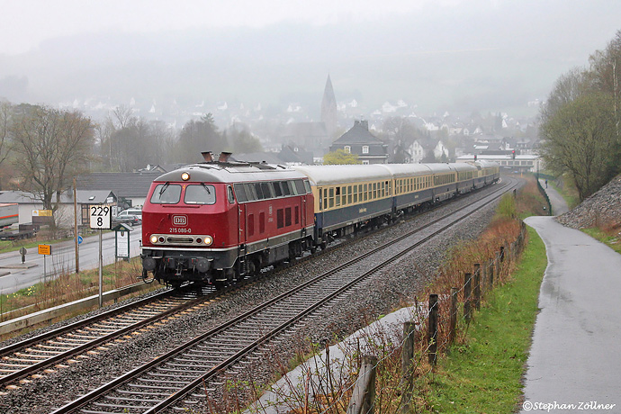 Für den 15. April 2017 hatte das Nostalgiezugreisen-Team zu einer Sonderfahrt von Köln nach Eisenach eingeladen. Die äußerst reizvolle, artreine Zuggarnitur mit der traumhaften 215 086 als Zuglok mußte auch bei der am Samstagmorgen herrschenden Weltuntergangsstimmung fotografisch festgehalten werden. Aufnahme bei der Durchfahrt am Nuttlarer Dümel.