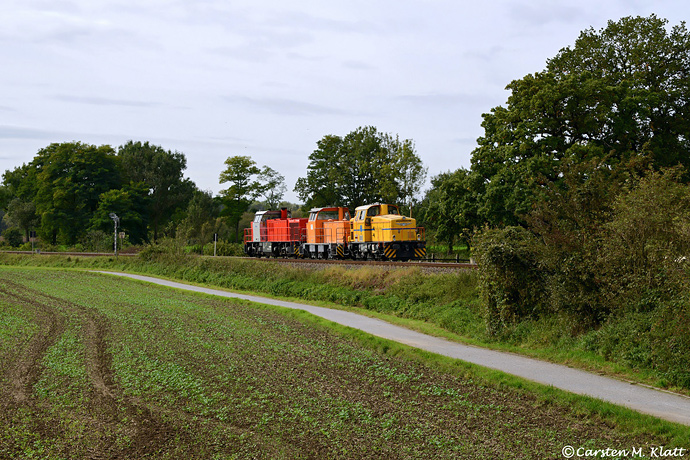 In den Feldern am Ruhrtalradweg bei Altendorf stand Carsten Klatt am 29. September 2017 und blickte dieser interessanten Loküberführung von Horlecke nach Hattingen hinterher. Den Zugverband bildeten: WLH Lok 58 + Lhoist Lok 4 sowie Zuglok Railflex 275 814.