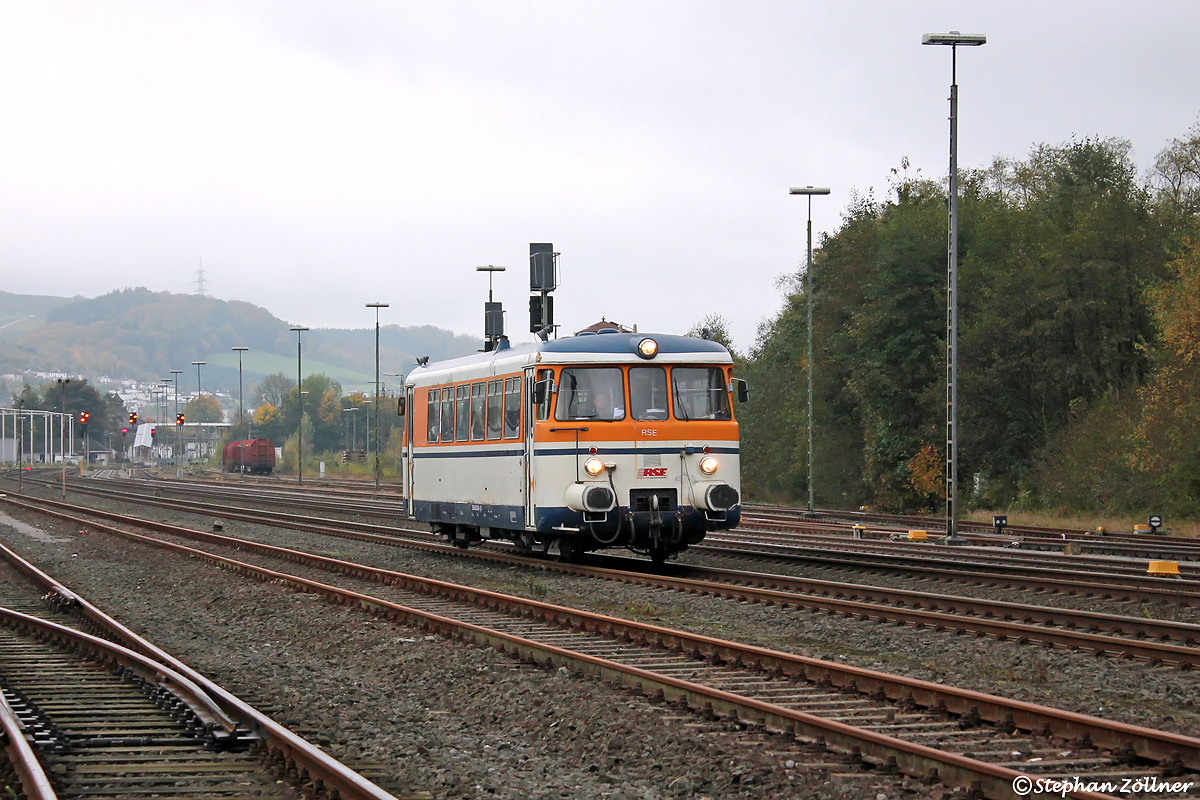 Grau in grau präsentierte sich das Wetter am 13. Oktober 2017 über Bestwig, als VT 9 der Rhein-Sieg-Eisenbahn auf Charterfahrt von Bielefeld auf dem Weg nach Marburg an der Lahn die Ausfahrt im Güterbahnhof passierte.
