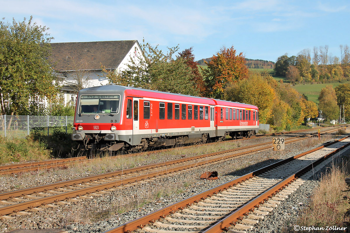 In 2017 der letzte Herbst für die Baureihe 628 im Oberen Ruhrtal ? Das gilt auf jeden Fall für die Triebwagen der Kurhessenbahn, denn ab Dezember kommt die Linie R 42 von Marburg nicht mehr nach Bestwig. Am 18. Oktober konnte 628 526 als RB 23218 noch an der Schützenhalle in Nuttlar angetroffen werden.