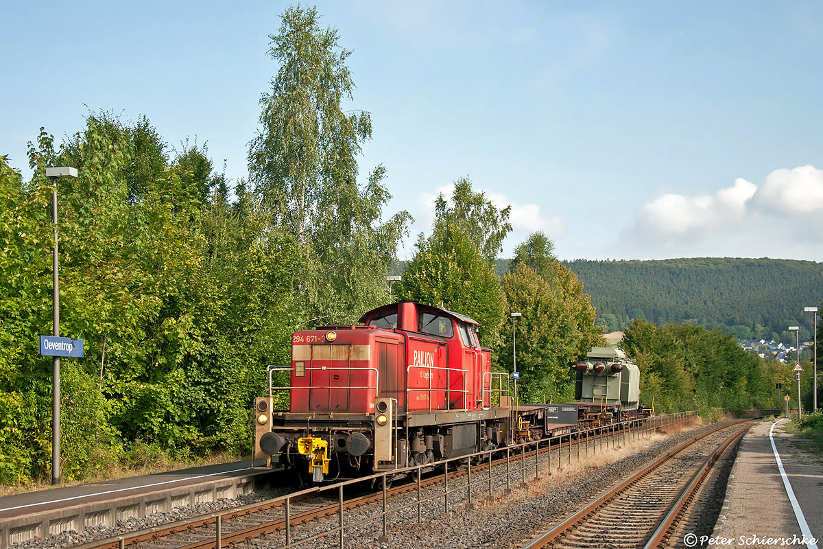 Nachdem im Zuge der Modernisierung des Umspannwerks Bigge-Olsberg am 10. August 2018 nach 2015 nochmals ein 110-kV-Trafo von Hamm aus zugestellt wurde, kommt 294 671 in der Folgewoche am 15.08. mit dem ausgetauschten Alttrafo in Oeventrop des Weges. Peter Schierschke war zur Stelle und hatte auch Glück mit der Sonne an der einzigen vormittags zwischen Bestwig und Schwerte frontbeleuchteten Fotostelle.