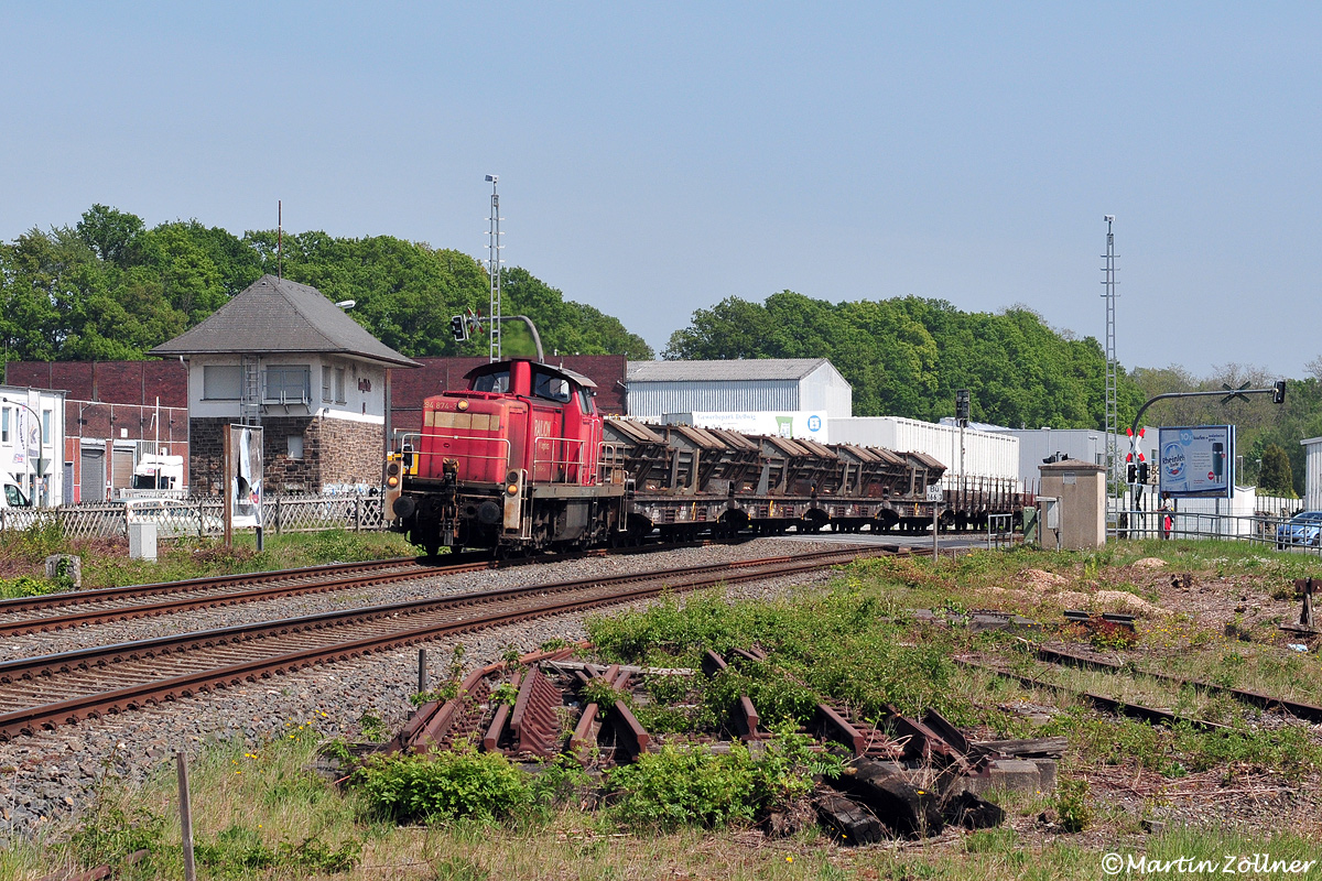 Am 08. Mai 2020 konnte aufgrund des Ausfalls des Horlecker Zugteils die Nachmittagsübergabe von Menden zum Schwerter Güterbahnhof nur mit den Wagen von KME Europa bereits 14.45 Uhr bildlich beim Queren des freigeschnittenen Langscheder Bahnübergangs Hauptstraße festgehalten werden. Im Vordergrund liegt noch immer die im Jahre 2000 im Zuge der Abbindung aller Nebengleise ausgebaute Weiche vom Anschluß Containerherstellung ⁄ RWE und wartet auf bessere Zeiten.