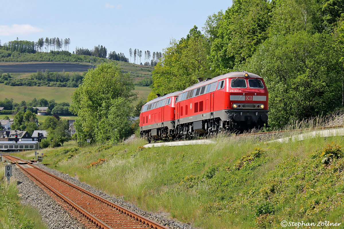 Am Pfingstsonntagnachmittag 2020 war für das Verkehren einer 218.8 durch das Sauerland eine Einlegung vorhanden, welche eigentlich gar nicht fotografisch verewigt werden sollte. Nach einer Meldung, dass es sich um 2 Loks handelt, kam dann kurzfristig doch noch die Kamera am Nuttlarer Dümel bei leider schon hohem Grasbewuchs zum Einsatz. Das Bild zeigt eine Überführung von Köln nach Halle (Saale).