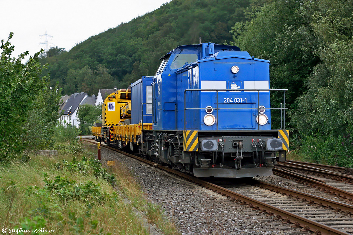 Recht kurzfristig erreichte den Fotografen am Nachmittag des 26. August 2020 die Nachricht, dass soeben ein Kranzug durch das Obere Ruhrtal überführt werde. Gerade noch rechtzeitig konnten die dringend erforderlichen, botanischen Maßnahmen beendet werden, als die Press 204 031 auch schon an der Nuttlarer Standartfotostelle ums Eck kam.