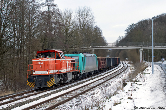 Den mit Zuglok RLG 54 sowie Wagenlok 185 619 der Holzlogistik und Güterbahn Bebra bespannten Holzzug aus Sundern vom 16. Februar 2021 konnte Peter Schierschke nach diversen Aufnahmen im Röhrtal auch noch unter der Fußgängerbrücke am Neheimer Freibad aufnehmen. Hier das bildliche Ergebnis.