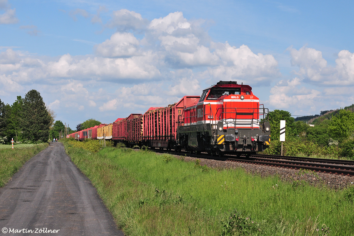 Am Freitagnachmittag, den 28. Mai 2021 stand für RLG 57 noch die Abfuhr eines Borkenkäferschadholzzuges ab Sundern (Sauerland) auf dem Schichtplan. Bei Wolkenlotto-Wetter konnte der Zug auf dem Weg zur Zwischenstation Schwerte Gbf bei Bentrop von zwei Fotografen bildlich festgehalten werden. Ab dort war dann Raildox für den Transport zum Sägewerkskunden zuständig.