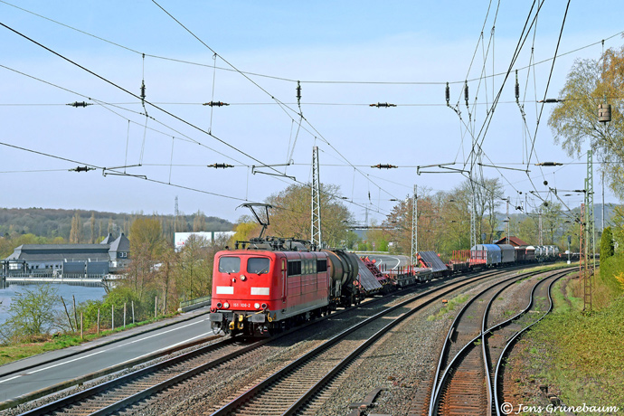Am 13. April 2022 war Jens Grünebaum mit dem Dreirad 363 210 auf dem Weg von Schwerte nach Hagen Vorhalle. In der Ostausfahrt Westhofen begegnete ihm der von 151 106 gezogene EZ 51241 nach Maschen, wie dieses Bild mit dem links gelegenen Ruhrpumpwerk zeigt.