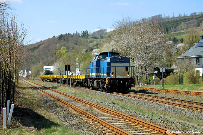 Nuttlar am 20. April 2022: Langsam kommt auch im höheren Sauerland der Frühling an. Spitzke Lok V 100 SP 008 hatte die Aufgabe fünf Res-Wagen für eine Baustelle der Kurhessenbahn von Moers nach Willingen zu überführen und fuhr auf die Minute pünktlich dem Fotografen am Bahnübergang Kirchstraße 2 vor die Linse.