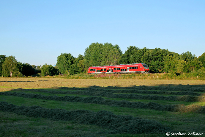 Die letzte Möglichkeit am 16. Juli 2022 vor Sonnenuntergang eine Zugfahrt in der Abendsonne an der im Frühjahr freigeschnittenen Kurve in der Gemarkung "Alte Wiese" in Enste aufzunehmen, bestand um 20.20 Uhr mit dem RE 10742 nach Dortmund. 633 106 war an jenem Tag für diese Leistung eingeteilt.