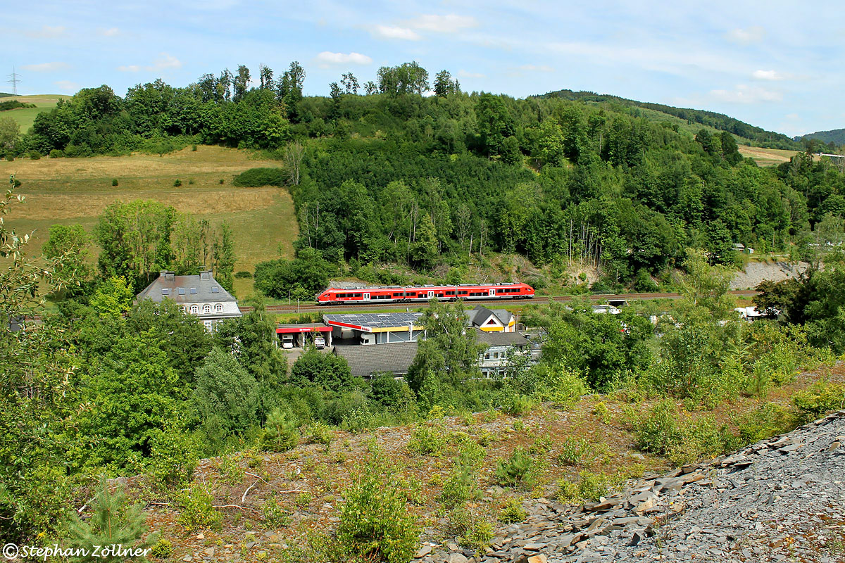 37 Jahre nach Einstellung der Förderung aus dem Kaiser-Wilhelm-Stollen des Schieferbaus Nuttlar gibt es noch einen freien Durchblick im Bewuchs von der weithin sichtbaren, riesigen Abraumhalde auf die Gleise der Oberen Ruhrtalbahn. Am 28. Juli 2022 rollt nachmittags ein unbekannt gebliebener 633 als RE 10718 die Rampe herunter auf Bestwig zu.
