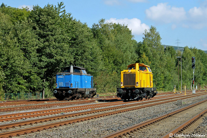 Eine im Jahr 2022 in Bestwig äußerst seltene Begegnung zweier ex-DB V 100 konnte am 30. September im Gbf aufgenommen werden. Während 212 009 der European Fleet Management GmbH & Co. KG aus Hamburg abgestellt auf ihren nächsten Nachtbauzugeinsatz wartet, setzt 212 306 der Bahnbaugruppe in die Abstellgleise um. Sie wird eine Fuhre leerer Samms-Wagen später Ruhrtal abwärts nach Hagen bringen.