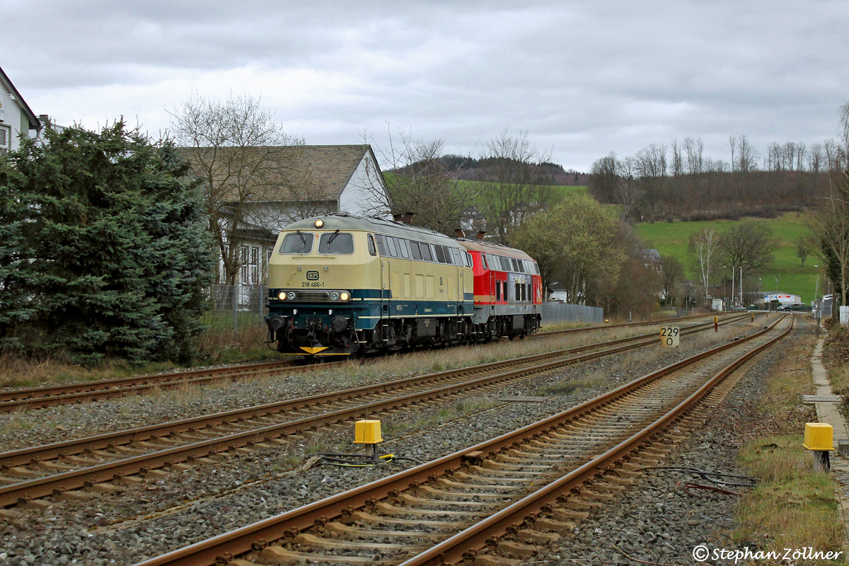Für den Nachmittag des 22. März 2023 war wieder eine Fahrzeugüberführung der Fa. Railsystems RP durchs Obere Ruhrtal abwärts avisiert. Kurz vor Licht aus kamen 218 466 und 469 "Betty Boom" dann gemeinsam um zwanzig nach fünf durch Nuttlar gefahren.