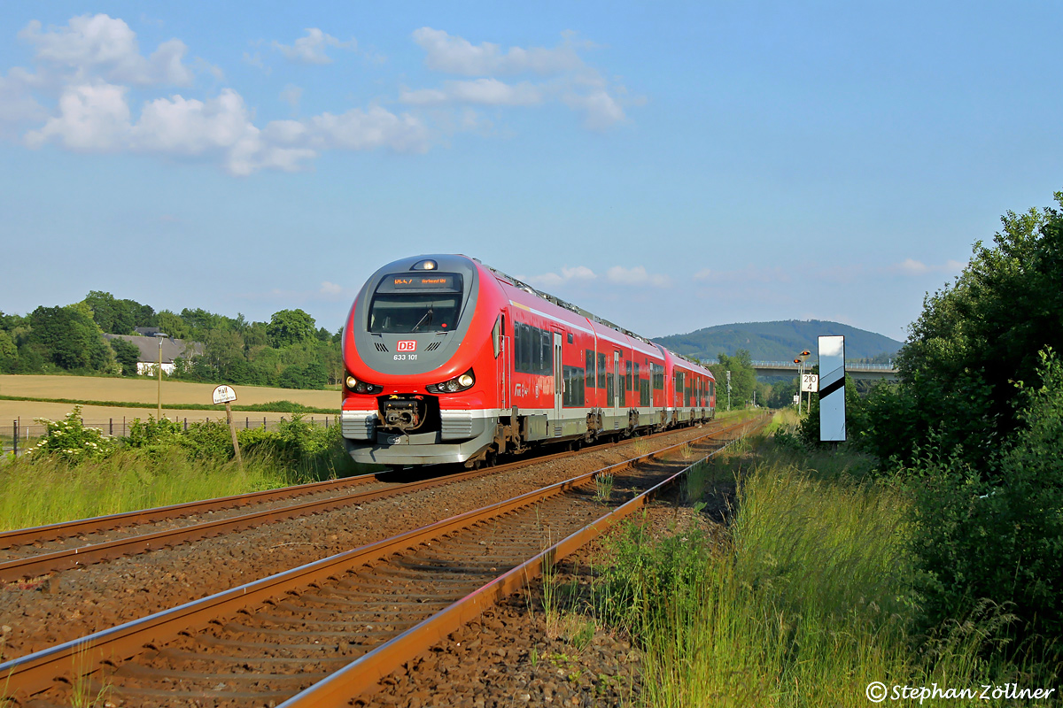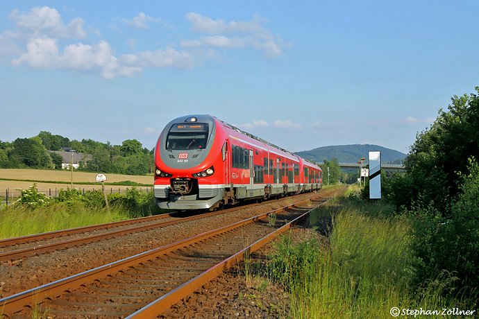 Ein schöner, heißer Sommertag neigt sich dem Ende zu. Von der kleinen Bachbrücke über Hausbergs Siepen an der Osteinfahrt von Freienohl konnte am 10. Juni 2023 der RE 10772 nach Dortmund in Form von 633 101 und 103 in der Abendsonne aufgenommen werden.