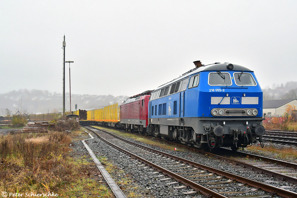 Typisches Novemberschmuddelwetter bestimmte den 21.11.2023. An der Arnsberger Ladestraße herrschte eisenbahntechnisch noch Ruhe, als Peter Schierschke dort bei der Holzverladung die Press 218 055 samt 189 800 abgestellt antreffen konnte.