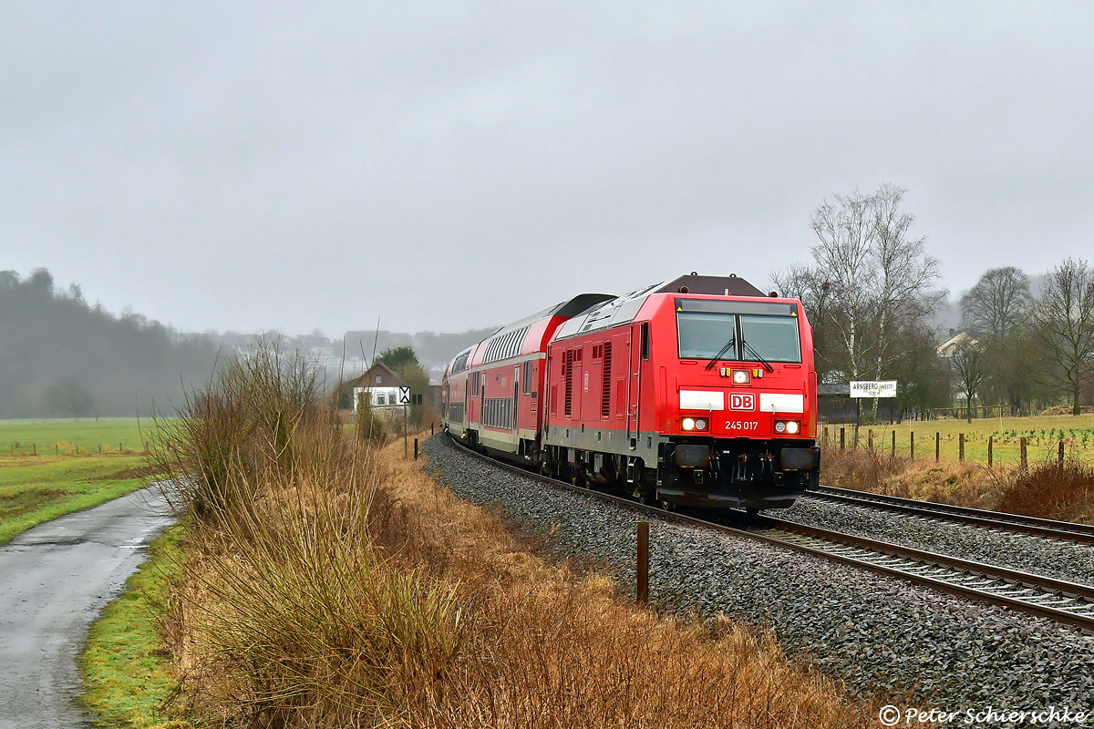 Auch Peter Schierschke trotzte dem Dauerregen am 03. Februar 2024 bei Uentrop, um den Sonderzug zum Skispringen in Willingen von Hamm nach Usseln bildlich zu dokumentieren. Hier sein Ergebnis an der Arnsberg 1500 Meter-Tafel.