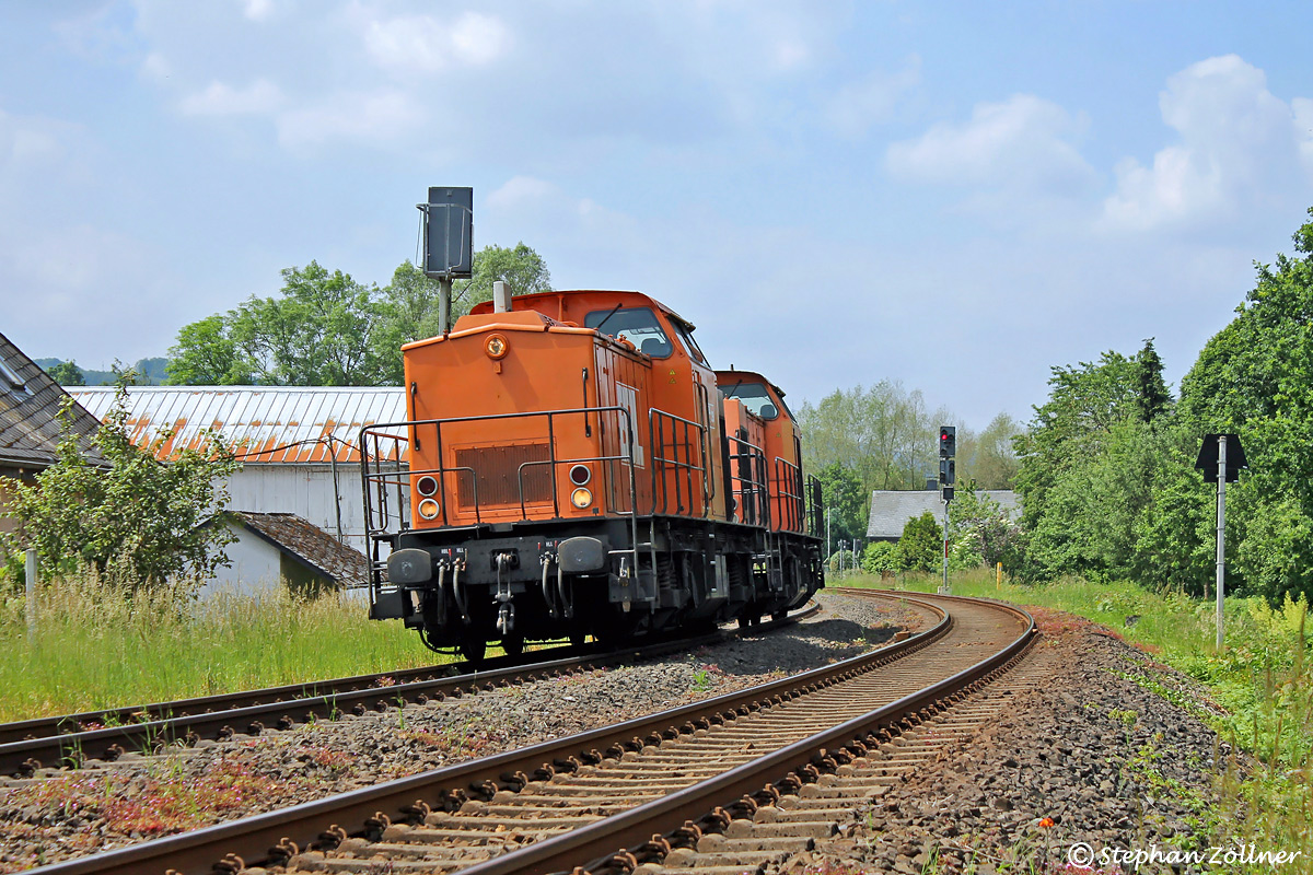 Die Loks 25 und 11 der Fa. BBL Logistik waren am 07. Juni 2024 im Ruhrtal unterwegs zum Baustelleneinsatz nach Brilon Wald. Nach einem Tankstop in Bestwig konnte die Weiterfahrt am Blocksignal 973 der Abzweigstelle Nuttlar fotografiert werden.