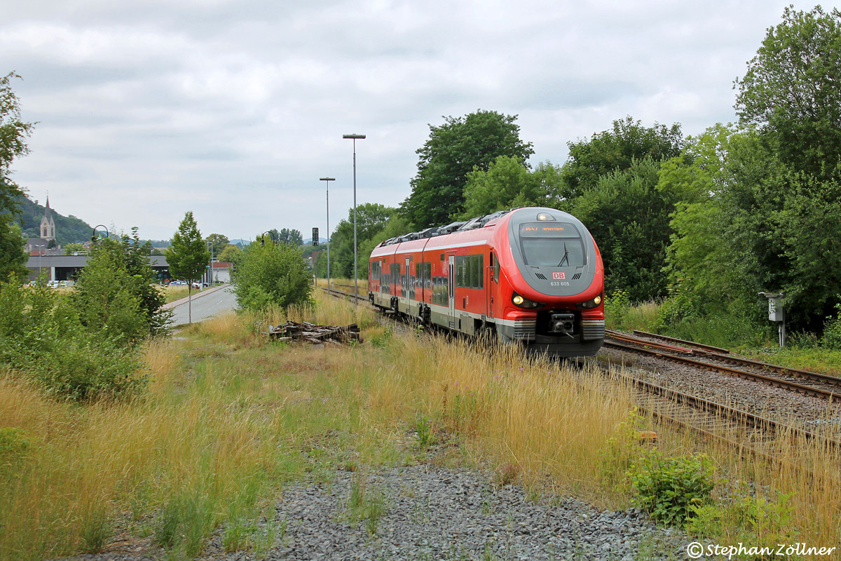 Gleismäßig nur noch minimalistisch ausgestattet ist in den 2000er Jahren auch der Bahnhof Marsberg. Auf den zwei vorhandenen, durchgehenden Hauptgleisen ist maximal eine Zugkreuzung durchführbar, sonst geht nichts mehr. Völlig verkrautet auch die Ostausfahrt, wo am Mittag des 18. Juli 2025 633 105 als RE 63367 nach Warburg vor die Kamera kommt.