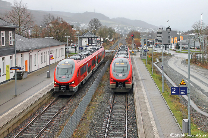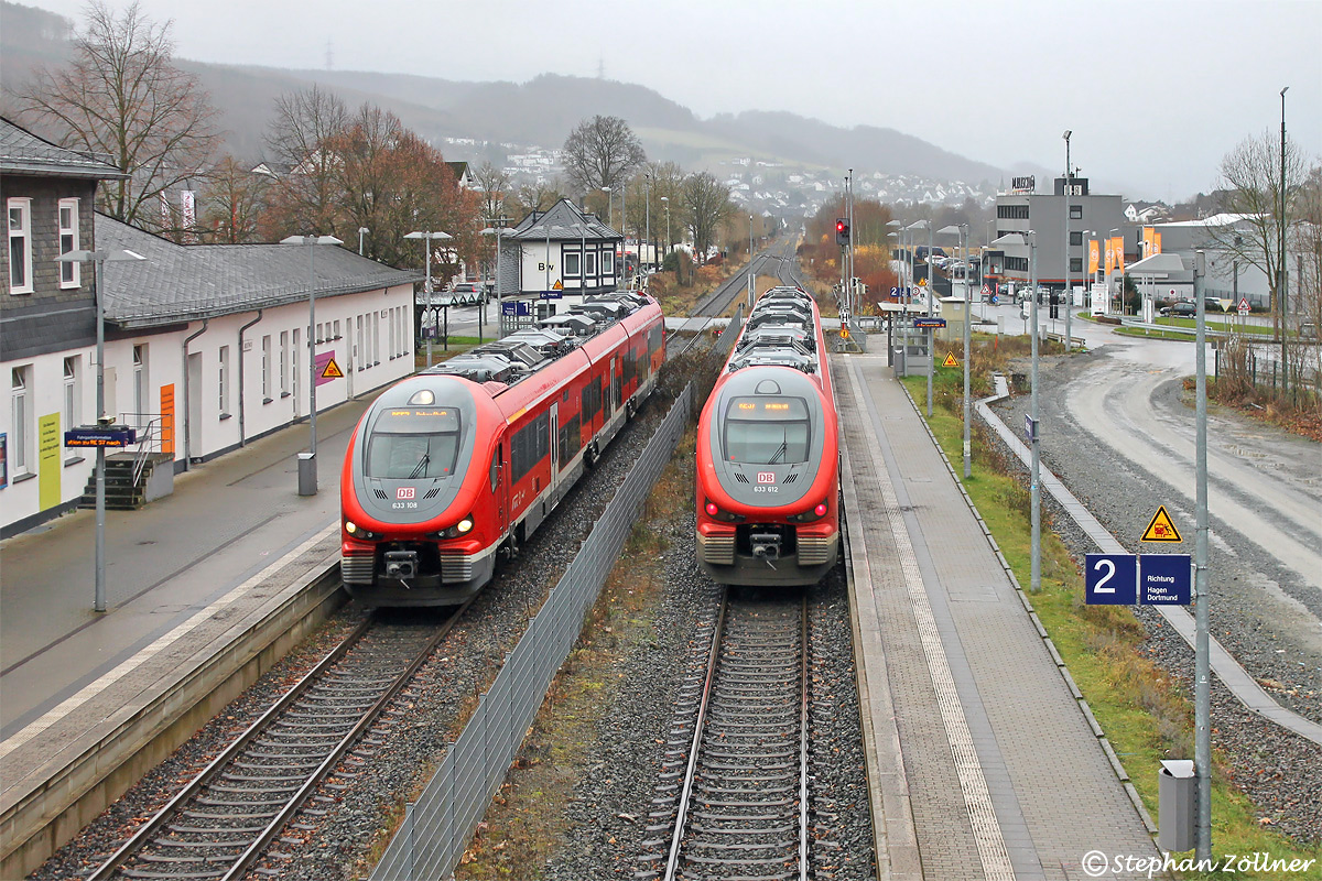 Personenzugbegegnungen in Bestwig am Bahnsteig sind in den 2020er Jahren nur möglich, wenn der bergwärts fahrende Takt um etwa zehn Minuten verspätet ist. Dies war vor Mittag am 08. Dezember 2025 um fünf nach Elf der Fall, wo sich 633 108 als RE 10757 auf dem Weg nach Warburg links und der in Gleis 2 auf den Winterberger Zugteil wartende 633 112 (RE 10796 nach Dortmund) rechts treffen.