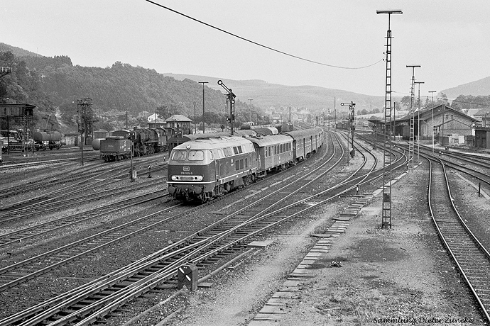 Ein herrliches Bild aus der Sammlung von Dieter Zuncke, aufgenommen am 06.09.1971, aus dem ehemaligen Fahrdienstleiterstellwerk "Bf" in Bestwig: Ein halbes Jahr vor dem Ende der dortigen Dampflokbeheimatung fährt die noch neue 218 009 mit einem Eilzug am Zwischensignal S 2 vorbei gen Bahnsteig in den Personenbahnhof. Hinter dem Schneepflug zwei anscheinend schon nicht mehr benötigte Dampfloks der Baureihe 050.