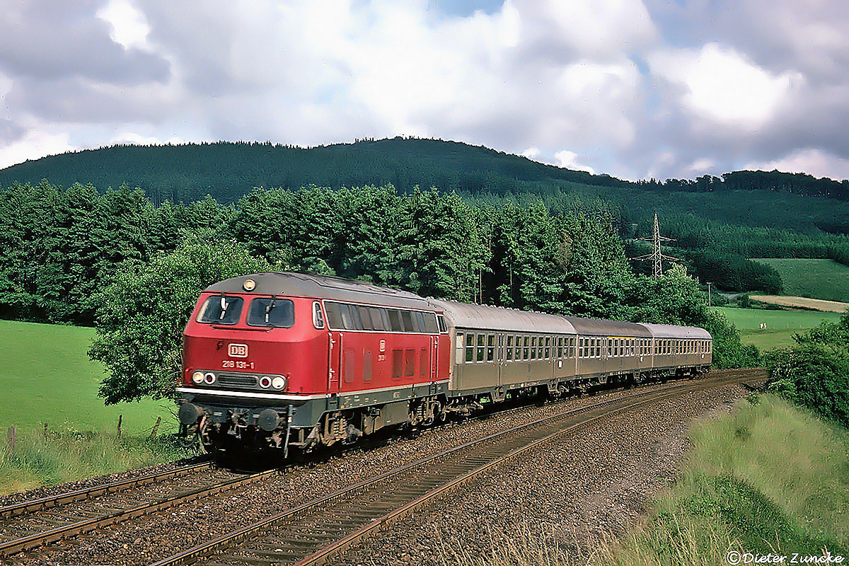 Leider mit kleiner Bewegungsunschärfe präsentiert sich dieser, von 218 131 talwärts beförderte Eilzug in perfekt passender Zusammenstellung am Olsberger Gierskopp. Dieter Zuncke hatte am 16. Mai 1976 Glück mit den Wolken, als er diese sonnige Aufnahme anfertigten konnte.