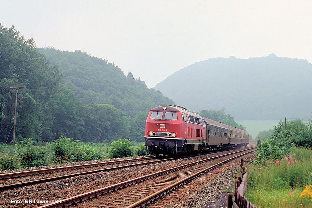 Der 11. Juli 1981 war ein dunstiger Sommertag. 218 134 hatte den von Dortmund kommenden E ⁄ N 3493 in Schwerte übernommen und bringt ihn –hier am Bahnübergang Grottenberg in Beringhausen fotografiert– bis ans Ziel nach Warburg.