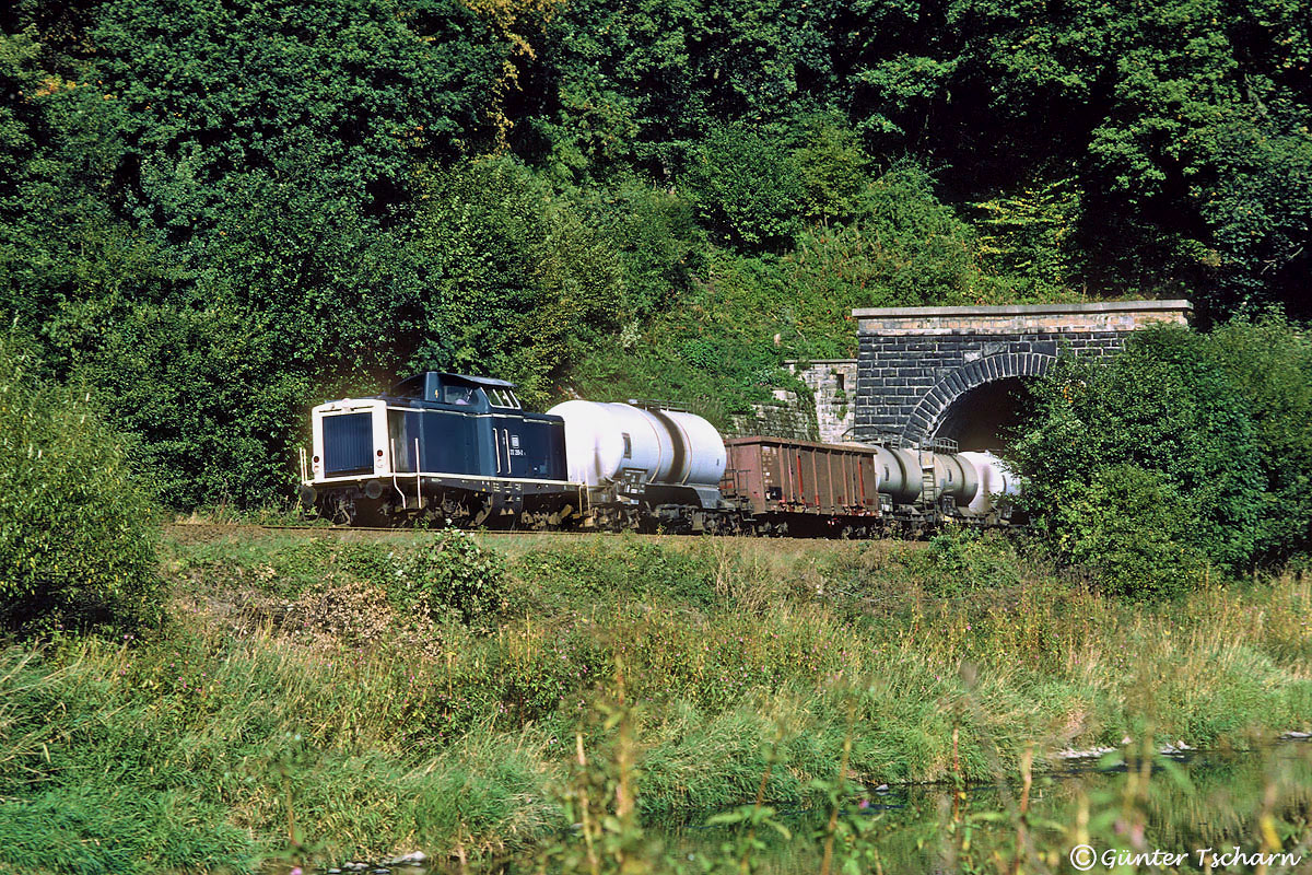 Am 01.Oktober 1983 war im Sauerland bestes Herbstwetter zu verzeichnen. Günter Tscharn konnte vom Ruhrufer aus die Hagener 212 299 mit der nur Samstags um diese Zeit verkehrenden Übergabe 69873 von Neheim-Hüsten nach Freienohl beim Verlassen des Glösinger Tunnels auf den Diafilm bannen.