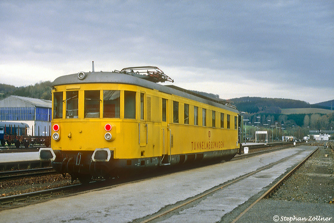 In der Abenddämmerung des 28. November 1984 ist der Tunnelmesswagen 712 001 im Bahnhof Arnsberg für Profilmessungen der Tunnel in Arnsberg, Oeventrop und Freienohl eingetroffen. Vor der Bahnmeisterei wartet er auf den Az-Führer, der das Fahrzeug erst einmal in die Abstellung begleiten wird.
