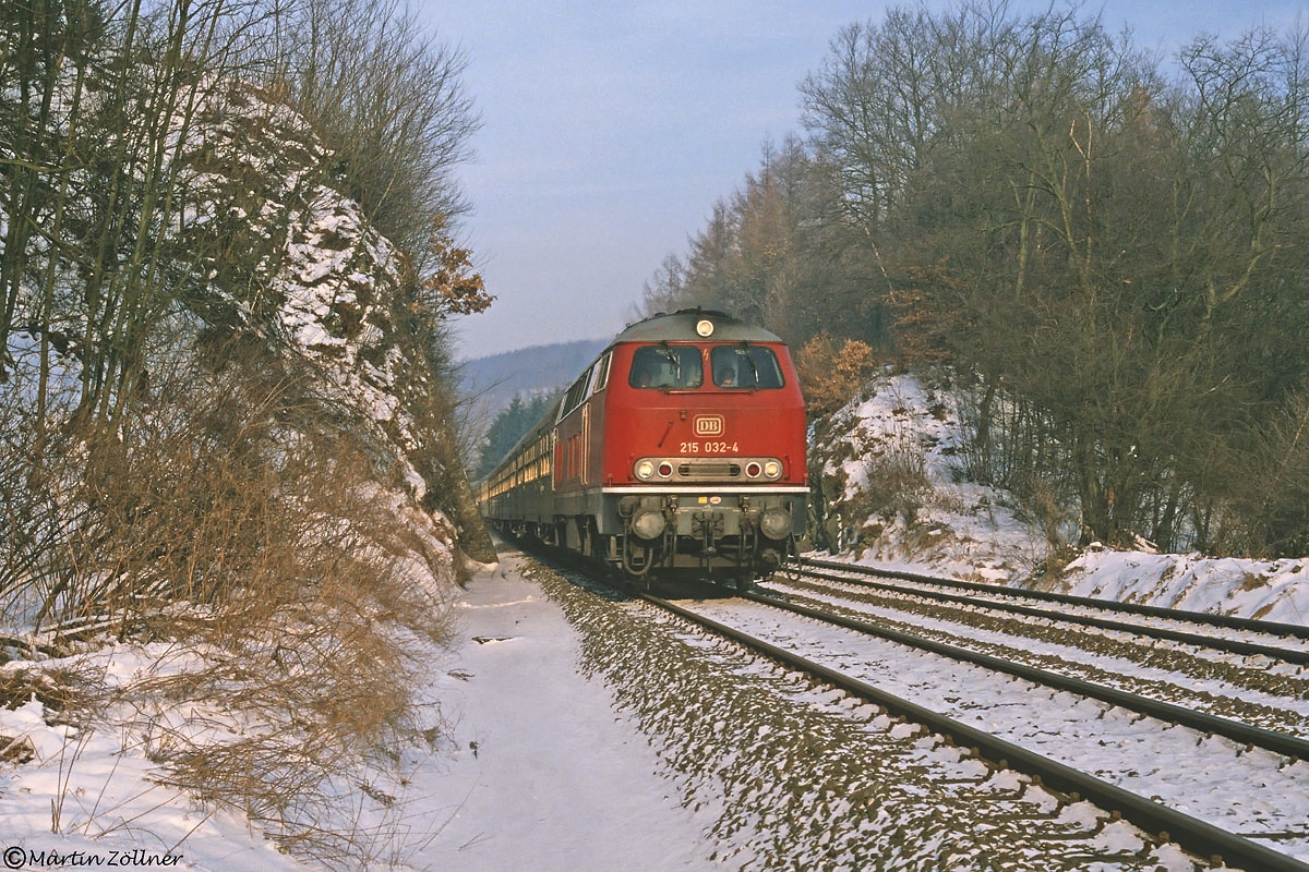 Am 23. Februar 1986 war die Schneelage im Hochsauerland ausreichend und somit Wintersport möglich. Die mit E-Heizung ausgerüstete Krefelder 215 032 brachte in den ersten Sonnenstrahlen des Tages ihren sonntäglichen EWi 25161 aus Mönchengladbach durch den Einschnitt bei Rumbeck dem Zielbahnhof Winterberg ein Stück näher.