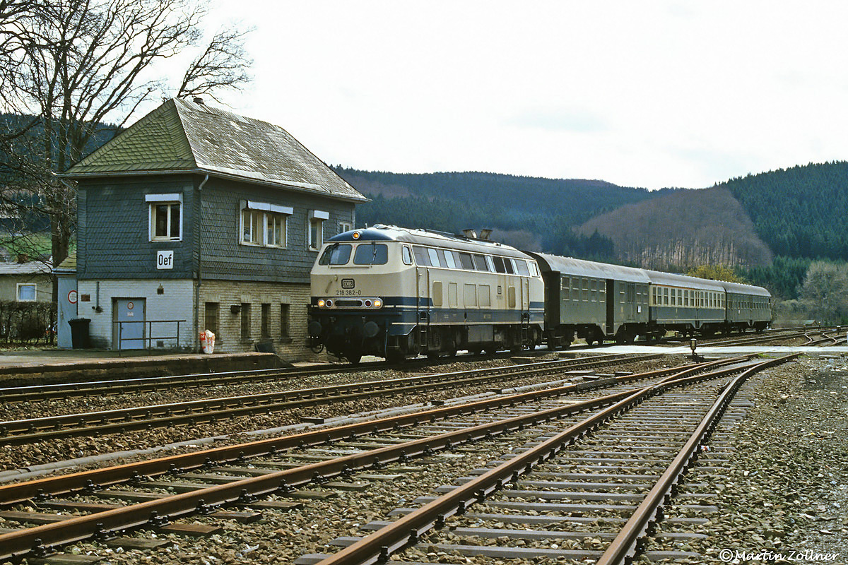 Die aus Kaiserslautern geliehene 218 382 bespannte am 22. April 1986 den E 3191 von Hagen nach Warburg. Am Nachmittag fährt sie neben dem Fahrdienstleiterstellwerk "Oef" an den Oeventroper Bahnsteig.