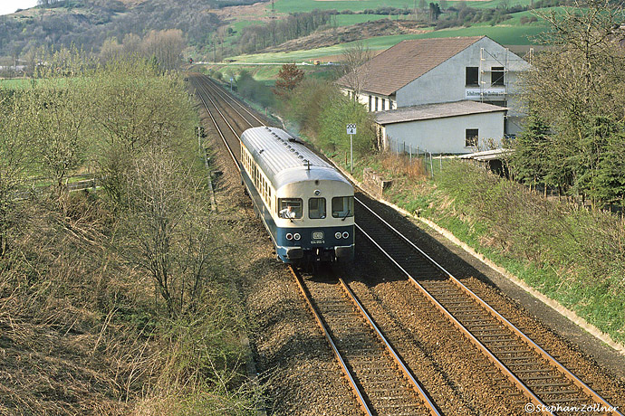 Triebwagenzuführungen zum Aw Kassel wurden schon immer auch durch das Obere Ruhrtal abgewickelt, wobei solo fahrende Triebköpfe der Baureihen 624 ⁄ 634 doch eher die Ausnahme bildeten. Am 19. April 1988 konnte durch Zufall solch eine Fahrt von der Uentroper Brücke bildlich festgehalten werden. Im Bildhintergrund zu sehen haben gerade die Rodungsarbeiten für die A 46-Trasse begonnen.