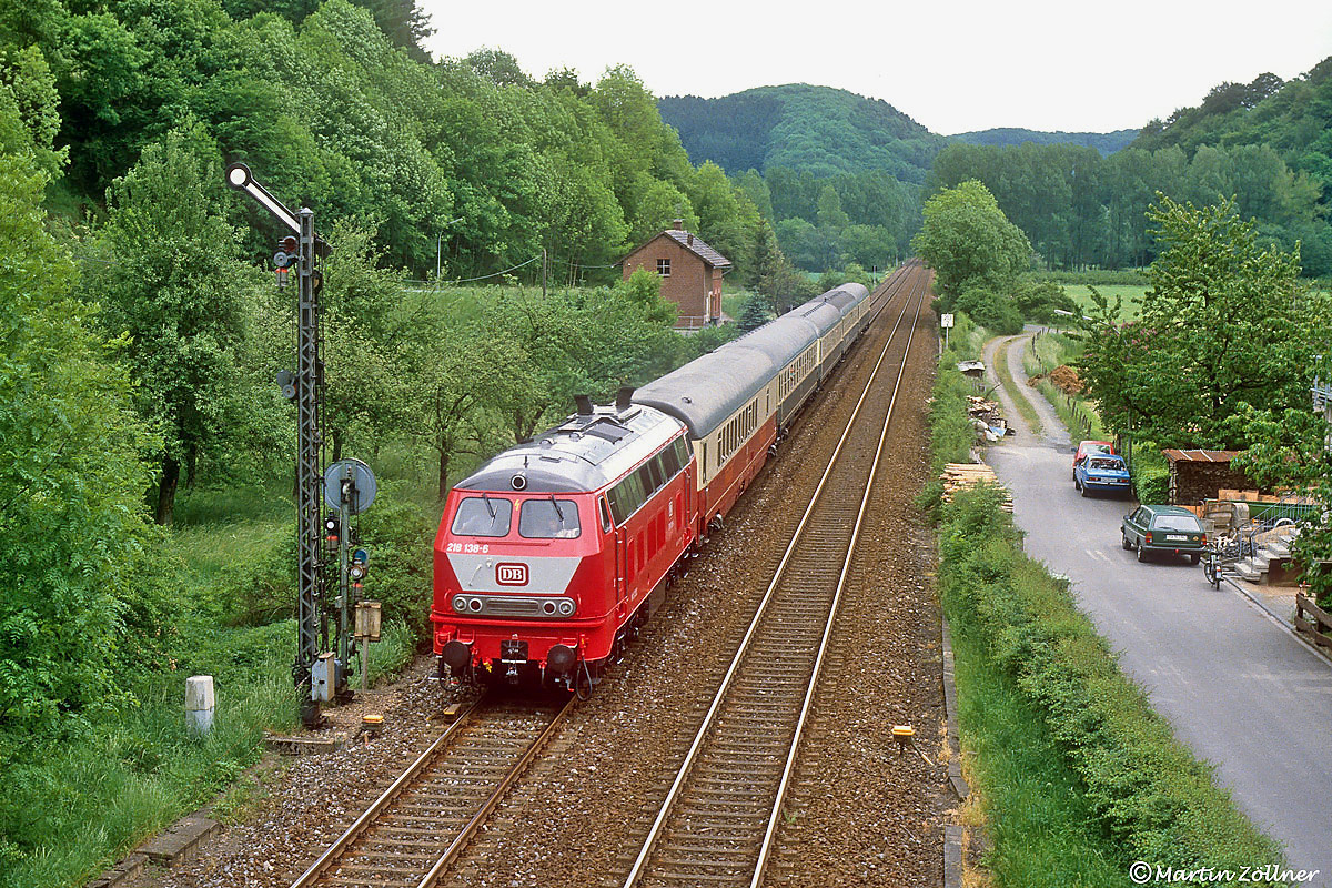Beim Bahnhofsfest in Arnsberg am 29. Mai 1988 gab es auch Pendelfahrten mit einer IC-Wagengarnitur nach Meschede. Am Einfahrtsignal Wennemen konnte eine Rückfahrt mit der frisch revisionierten 218 138 auf den Diafilm gebannt werden.