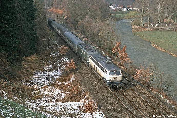 Im Zeitalter ohne Handy und Internet war es mitunter schwierig, Informationen zeitnah weiterzugeben. Als am 03.03.1990 in Hagen der Lokwechsel beim E 3893 Aachen - Kassel von 110 406 auf 218 150 samt der zum Heimat-Bw zu überführenden Bebraner 141 178 beobachtet wurde, konnte Fotograf 1 (im Dienst leider ohne Knipskasten) dank guter, alter Telefonzelle am Bahnsteig rechtzeitig Fotograf 2 zum Rumbecker Hammer ausrücken lassen, um dieses seltene Bilddokument anzufertigen.