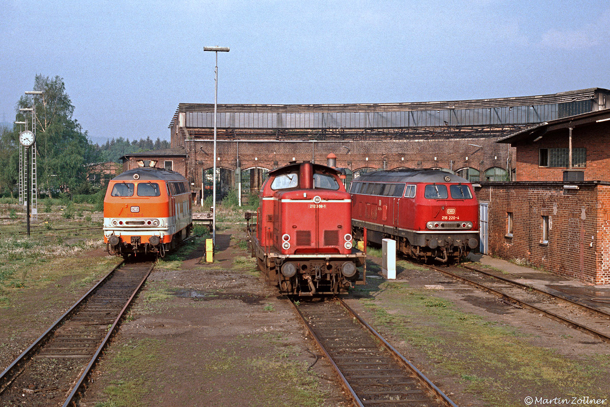 Im ehemaligen Bw Bestwig warten am frühen Morgen des 08. Mai 1990 vor der Kulisse des Ringlokschuppens drei Vertreter der seinerzeit im Sauerland allgegenwärtigen Diesellokbaureihen auf die nächsten Einsätze. Nach Abriss der Drehscheibe im Sommer 1987 wurden die Maschinen nun in den ehemaligen Zufahrtsgleisen 36-38 abgestellt.