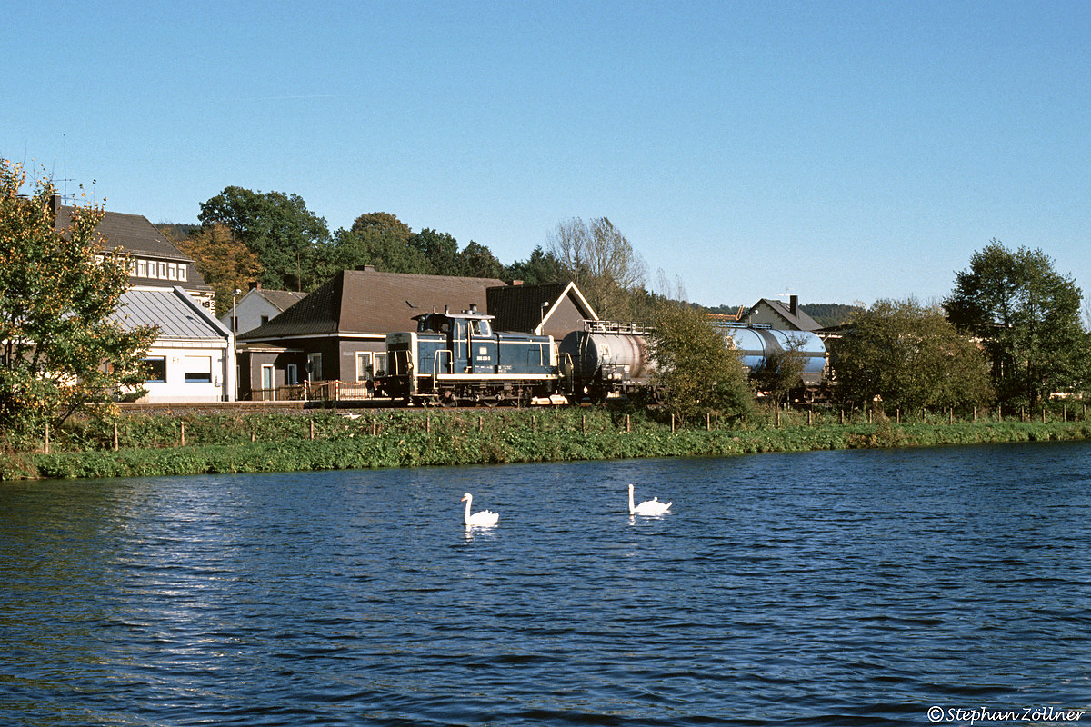Im Jahr 1990 wurde das Zellstoffwerk Wildshausen noch per Schiene von Neheim-Hüsten aus bedient. Da die Anschlussweiche vor dem Glösinger Tunnel nur talwärts an die Obere Ruhrtalbahn angeschlossen war, musste die Übergabe zum Umsetzen bis nach Freienohl fahren. So auch am Nachmittag des 22. Oktober, als 365 215 vor dem neuen Stellwerk an der aufgestauten Ruhr auf Ausfahrt wartet.