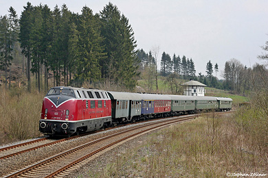 Im Zuge des Abrisses des Bahnhofs Olsberg wurden auch alle Nebengleise entfernt. Am 26.04.2008 ist an der westlichen Ausfahrt die V 200 der Hammer Eisenbahnfreunde im Rahmen einer Sonderfahrt von Korbach nach Winterberg unterwegs. In Kürze wird rechts ein neuer GSM-R - Zugfunkmast die Szenerie "bereichern". |