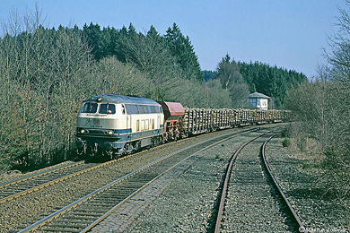 Im September 1982 erfolgte die Umwandlung der Blockstelle Olsberg in die Awanst Gemeinde Olsberg. Der Buchfahrplan sah in der Folgezeit noch ein paar Jahre die Bedienung der dortigen Ladestraße vor. Am 13. März 1995 existierten die stillgelegten Gleise noch, als die Kasseler 216 139 mit der langen Übergabe aus Marsberg gen Bestwig vorbeirollt. |