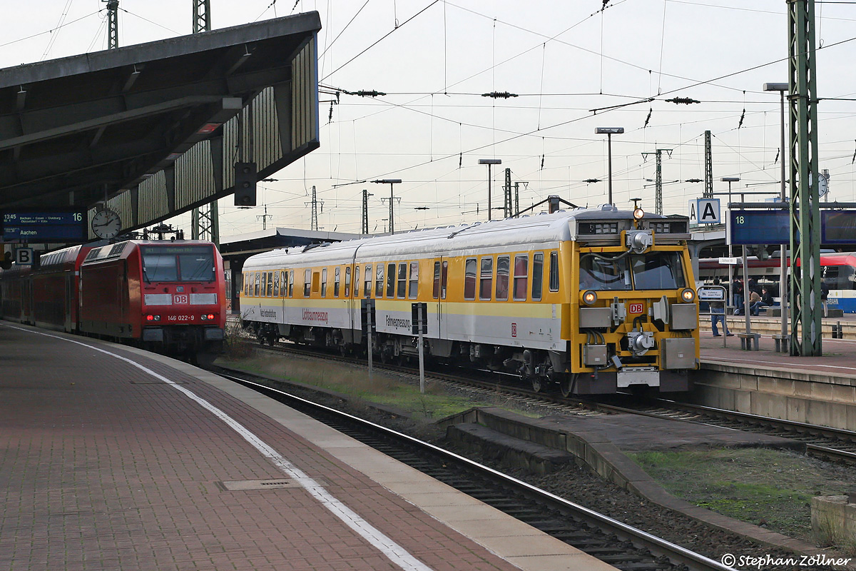 Zweckmäßigkeit geht vor Schönheit: Zum Sonnenuntergang steht am 19. November 2009 der Lichtraumprofilmeßzug 719 046 ⁄ 719 045 in Dortmund Hbf zur Abfahrt Richtung Hamm bereit, der seinen Umbau aus zwei 614 nicht verleugnen kann. Heute dominiert die Elektronik in Form von höchstwertigen 3D-Laserscannern in Verbindung mit GPS-Positionierung, früher war die Meßtechnik von Mechanik geprägt...