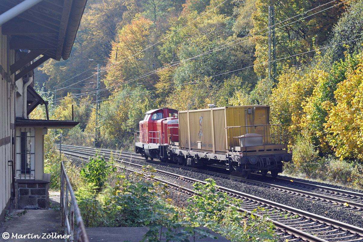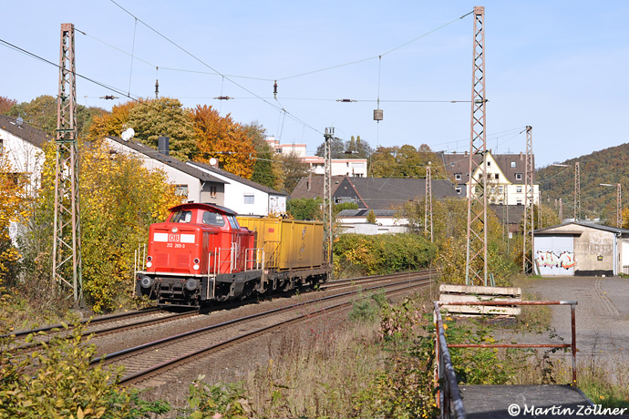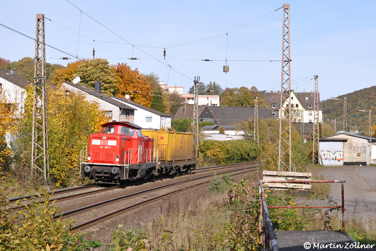 Wie so oft ist der herbstliche Schienenpflegezug zur Mittagszeit im Lennetal unterwegs. 212 265 von DB Fahrwegdienste zieht den Riesenhochdruckreiniger am 29. Oktober 2010 durch die Überbleibsel des Bahnhofs von Nachrodt.