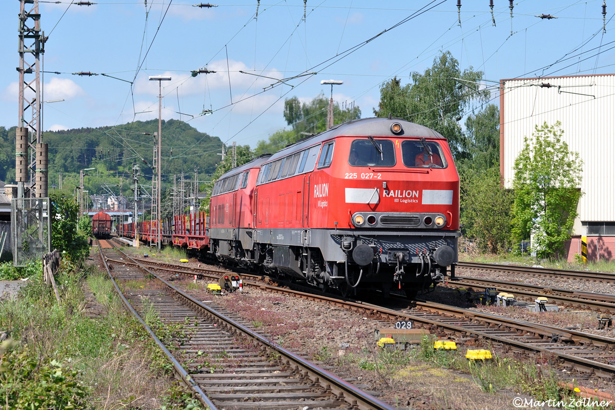 Fast am Ziel angekommen sind 225 027 und 133 mit ihrem Brammenzug von Duisburg zum Warmwalzwerk Hoesch Hohenlimburg, als das Doppel am 03. Mai 2011 soeben die Lennebrücke überquert hat. Zu der Zeit war noch ein größerer Lokbestand an 225ern in Oberhausen beheimatet.