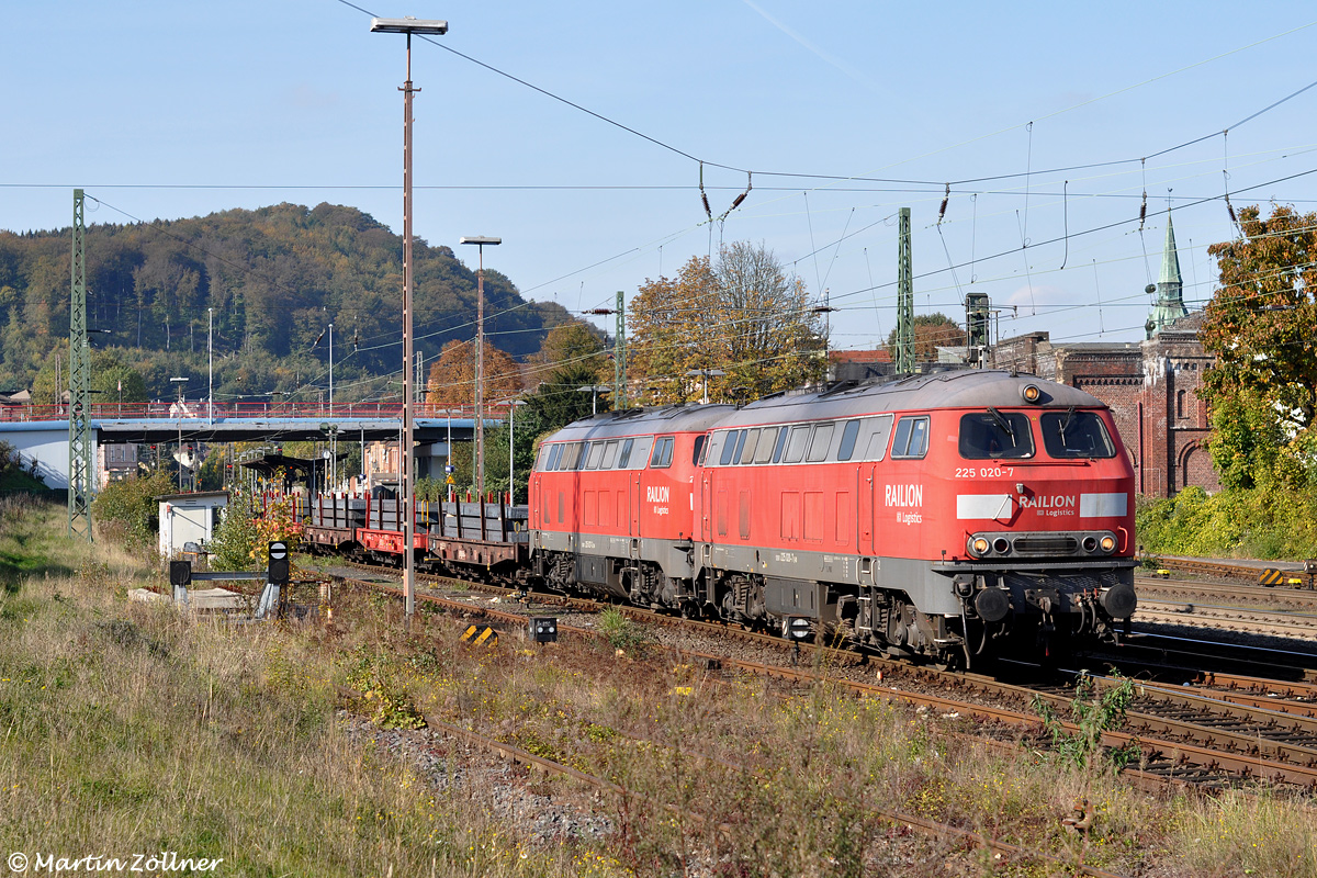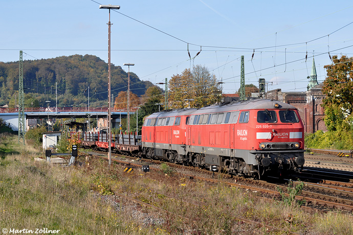 Am 21.10.2011 hat das Doppel aus 225 020 und 225 027 mit dem Brammenzug zum Hoesch-Walzwerk seinen Zielbahnhof Hohenlimburg erreicht. Nach kurzer Wartezeit geht es als Rangierfahrt weiter ins Werk. Heuer wurden die letzten Reste des alten Empfangsgebäudes an Gleis 1 abgerissen. Seit der Eröffnung der Straßenbrücke über den Bahnhof im Jahre 2010 erinnert nichts mehr an den Ende 1983 stillgelegten, am linken Bildrand gelegenen Übergabebahnhof zur Hohenlimburger Kleinbahn.
