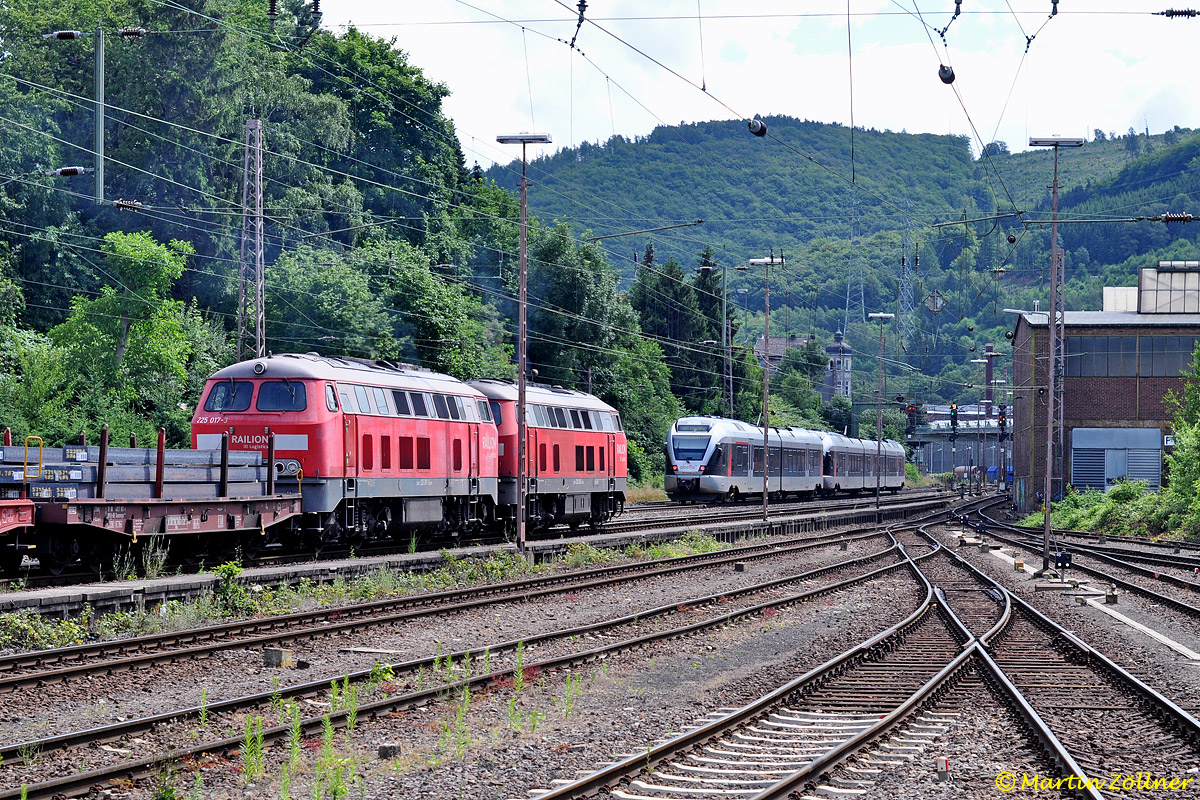 Eine ungleiche Wettfahrt liefern sich am 07. Juli 2012 der Brammenzug als Rangierfahrt zum Anschluß HOESCH und das Doppel aus zwei Abellio-Silberfischen an der Ostausfahrt von Hohenlimburg. Während der Abelliozug mit 90 Sachen auf Gleis 2 o Richtung Letmathe aus dem Bahnhof braust, zuckelt die Rangierfahrt über Gleis 3 o ins Warmwalzwerk mit gemächlichen 25 km ⁄ h am Oeger Güterbahnhof vorrüber.