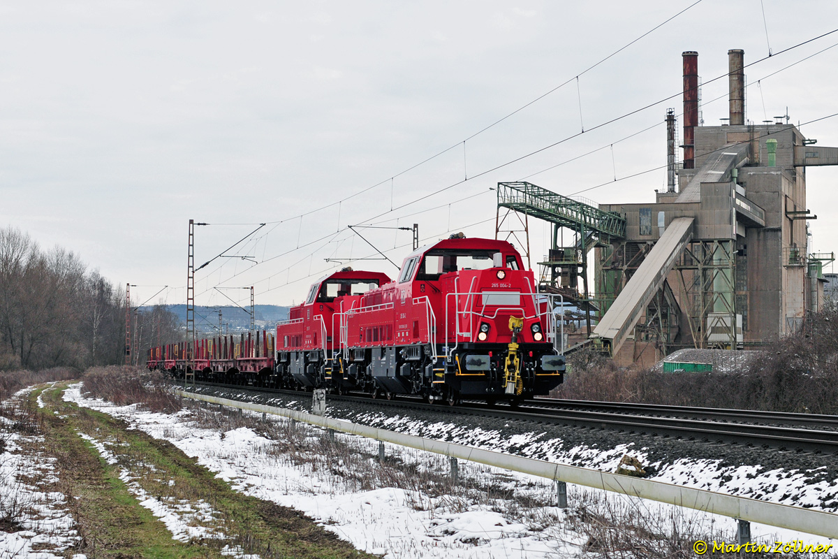 Neben der Kulisse des heute zur Lhoist-Gruppe gehörenden Rheinkalk-Dolomitwerks Hagen-Herbeck rollt das Doppel der neuen Voith-Gravita 15L BB mit dem Brammenleerzug von Hohenlimburg zur Wiederbeladung zum ThyssenKrupp-Stahlwerk nach Duisburg-Hochfeld Süd K ⁄ M vorrüber. Am 11. Februar 2013 stellen 265 004 und 011 die Bespannung sicher, seit Fahrplanwechsel Dezember 2012 läuft der Zug unter der Nummer GM 61254.