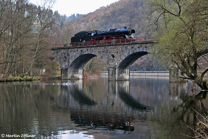 Nach einem Sonderzugeinsatz ab Bochum-Dahlhausen ist die 03 1010 des gleichnamigen Fördervereins am 22. April 2013 als Lokleerfahrt 74905 auf dem Weg über Siegen zum nächsten Einsatz nach Tresya. Hier überquert sie gerade den Lenneviadukt in Werdohl-Ütterlingsen und kann gerade noch in die immer dichter werdende Baumlücke eingepasst werden. Einige hyperaktive Enten vereiteln mit dem erzeugten Wellengang derweil die motivlich geplante Wasserspiegelung.