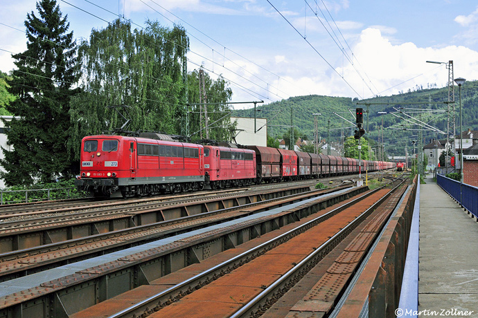 Als Tochterunternehmen der DB Cargo AG setzte die Fa. RBH Logistics (früher RAG-Bahn und Häfen) auch Loks der BR 151 ein. Am 17. September 2013 waren RBH 273 (ex DB 151 083) und RBH 267 (ex DB 151 144) für die Beförderung des leeren Kohlezuges von Großkrotzenburg nach Oberhausen West zuständig. Aufnahme bei der Durchfahrt Hohenlimburg.