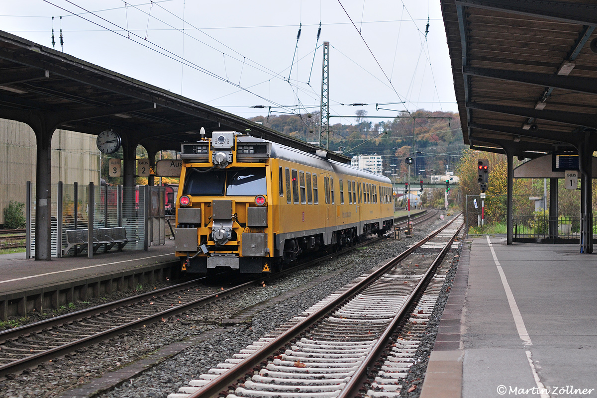 Am 03. November 2014 wurde die Strecke 2800 Hagen – Haiger digital erfasst. Am Nachmittag konnte bei der flotten Durchfahrt durch den Bahnhof Letmathe auch der am 719 046 angebrachte Messrahmen des Lichtraumprofilmesszuges 3 mit diesem Nachschuss bildlich dokumentiert werden.