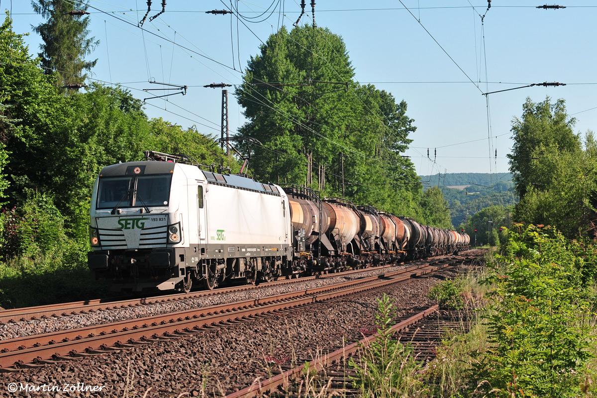Am 12. Juni 2015 hat der ansonsten Nachts verkehrende, aus Knickkesselwagen gebildete Kreideschlammleerzug Schwerte – Jesenice genügend Verspätung, um in den ersten Sonnenstrahlen bei der Durchfahrt durch den ehemaligen Nachrodter Bahnhof bildlich verewigt werden zu können, wenngleich der Sonnenstand für eine komplette Frontanstrahlung der Lok 193 831 vom Typ Siemens Vectron noch nicht ganz ausreichte.